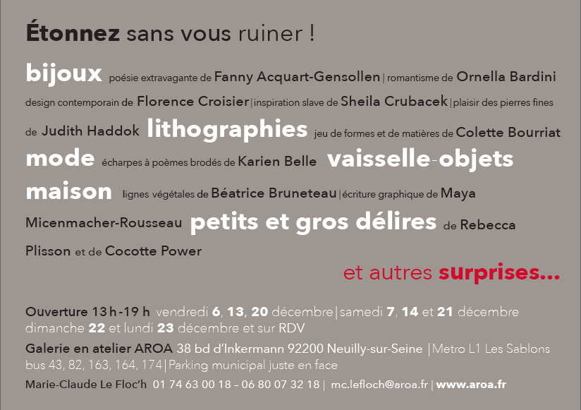 Les bijoux de Fanny font parti de la très belle sélection de Marie-Claude le Floc’h pour son exposition vente « Pièces Uniques pour Cadeaux Uniques » du 4 au 23 décembre. Venez découvrir les nouveautés de Fanny dans le cadre magnifique de cette galerie nichée dans un atelier d’artiste. Vernissage mercredi 4 décembre de 18h00 à 22h00 puis ouverture les après-midi de 13h00 à 19h00, les vendredis 6, 13 et 20, les samedis 7, 14 et 21, le dimanche 22 et le lundi 23 décembre ou sur rendez-vous, chez Aroa, 38, Boulevard d’Inkermann, 92200 Neuilly sur Seine. Vous aurez de grandes chances d’y croiser Fanny.