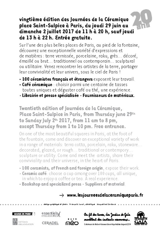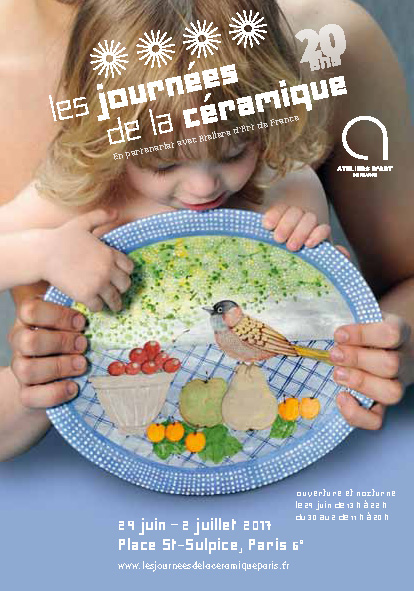 20ème édition des Journées de la Céramique du jeudi 29 juin au dimanche 2 juillet, Place Saint Sulpice à Paris. Entrée gratuite de 11h à 20h sauf jeudi de 13h à 22h.
