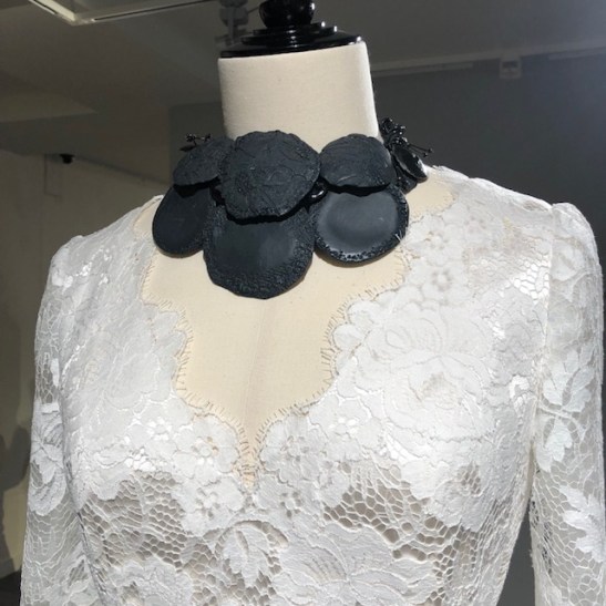 Courez voir cette exposition de C’Couture Paris au Musée de la Dentelle de Chantilly prolongé jusqu’au 2 février 2020. Vous y verrez des créateurs d’aujourd’hui en dialogue avec les dentelles d’autrefois. Délicatesse, légèreté, un concentré de savoir-faire au service d’une l’élégance intemporelle et combien français. Les bijoux céramique de Fanny Acquart Gensollen aux montages sophistiqués mélangent empreintes de dentelles, porcelaine noire et blanche et faïence émaillée.
